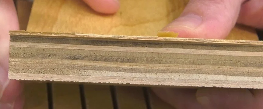 We made the mistake of assuming that the remaining ply (after making the cuts) was running along the length of the board. The grain seemed to be running down the length, but there was a catch. The outer birch veneer had its grain running lengthwise, but beneath that, the grain direction of the underlying ply ran in the opposite direction.
