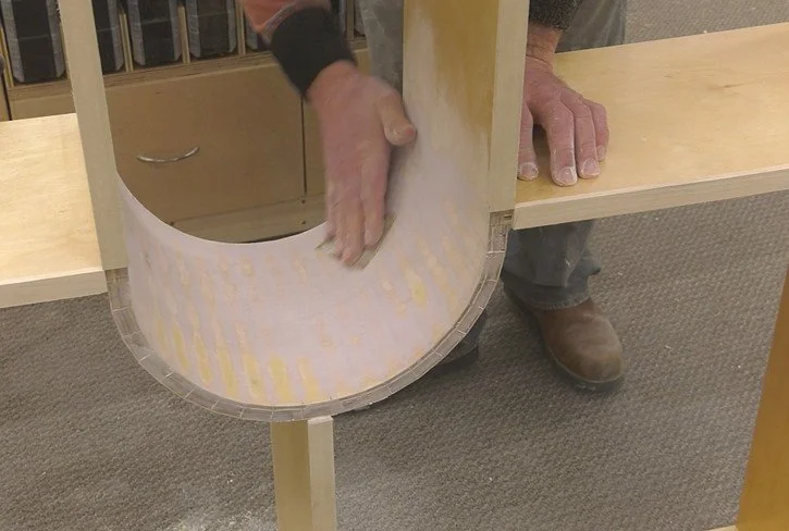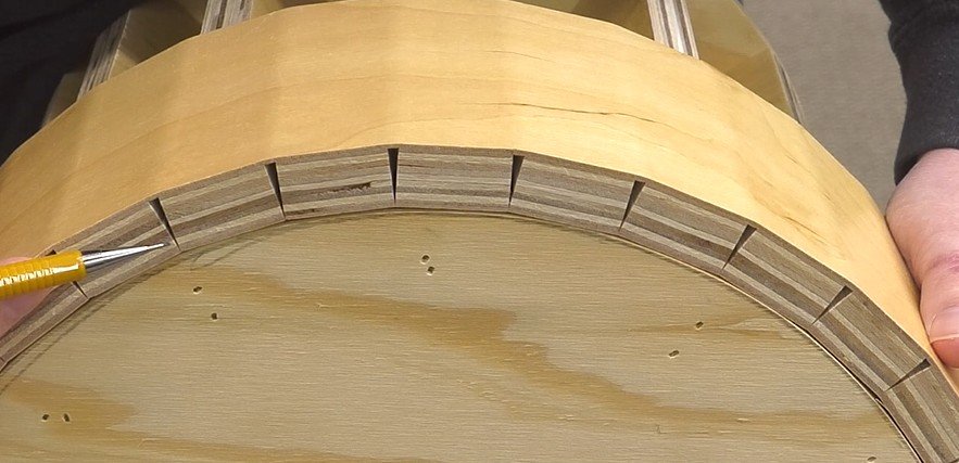 Here, you might notice one downside of this bending method: instead of a perfectly smooth curve, we ended up with a series of facets. If this had been solid wood, we could have reduced the appearance of these facets through sanding. But with plywood, sanding too much would have destroyed the birch veneer on the outside.