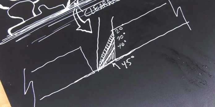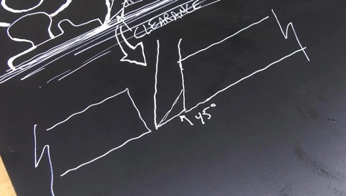 If you grind your bevel to 45 degrees, that, added to the 45-degree frog angle, would equal 90, putting the surface of the bevel parallel to the wood surface. That would prevent the iron from digging into the fibers, and your plane wouldn't work. So, we grind the bevel shallower to provide some relief so the edge can dig in. A lot of people go to great pains to make that bevel 30 degrees. That gives you 15 degrees of clearance, way more than you need. Frankly, four or five degrees is enough to overcome any compression in the wood fibers and still keep the heel of the bevel above the wood.