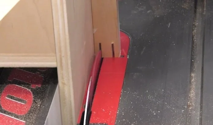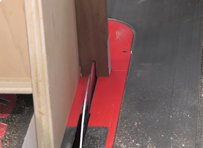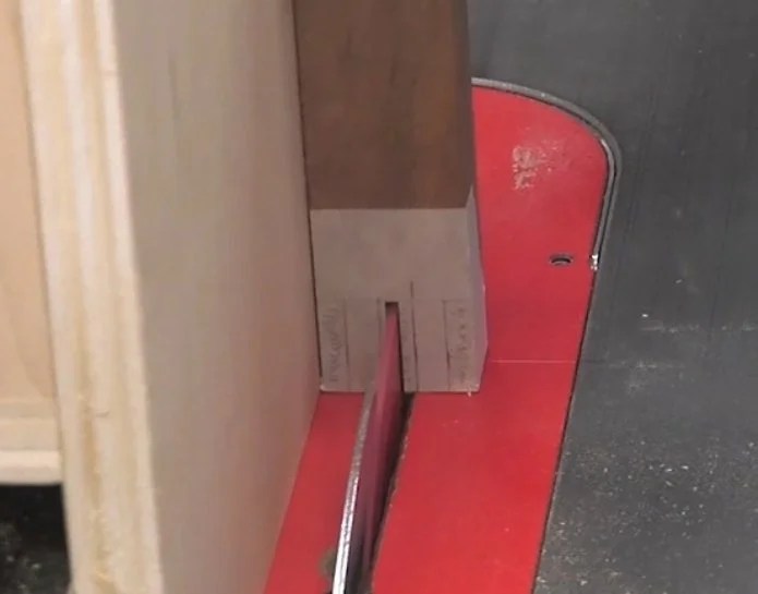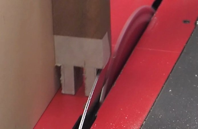 Once the height is dialed in, I rotate the workpiece 180 degrees and make another pass. This widens the kerf while keeping it centered on the end of the workpiece. If I need it wider, I move the jig a tiny bit closer to the blade and repeat the process.