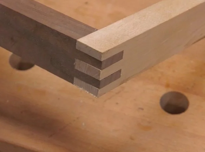 A double bridle joint is essentially five fingers (or tenons) that mesh together. Some folks have told me it just looks like a box joint. And if all the fingers are the same thickness—as these are—you could cut it with a box joint jig.