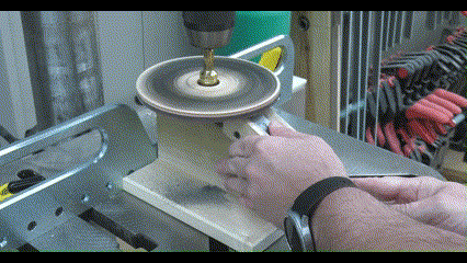 As I touch the bevel on the leather, I raise the handle just a tiny bit. This concentrates all the polishing right along the cutting edge. The speed of the disc means that in about 10 seconds, I’ve done the equivalent of 10 minutes of manual stropping.