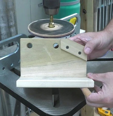 The jig simply slips under the disc, and my drill press runs at the normal speed I typically use it at. I’m not sure what the exact speed is—the whole point is for this to be quick and simple, so I didn’t worry too much about it.