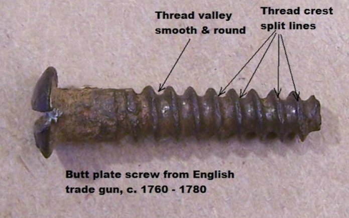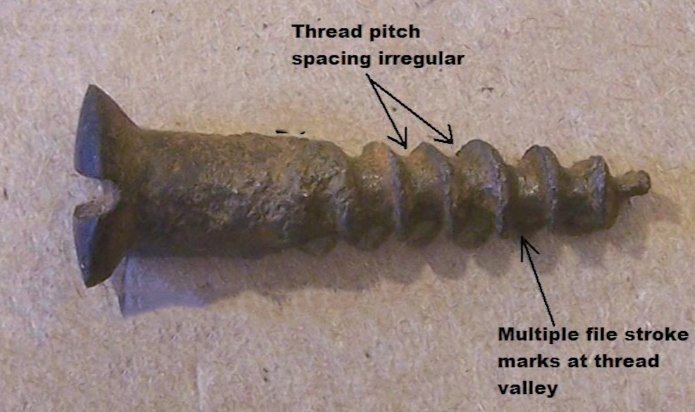 These early lathe-turned screws can sometimes be identified by the off-center and irregular slots on their heads, which were often still cut by hand with a chisel or saw—sometimes even by the woodworker himself after receiving them in his shop.