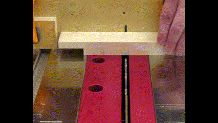 This is where the shim comes in. I'll place it between the end of my workpiece and the stop block, shifting the workpiece back so that the first cut falls in the precise location it needs to be.