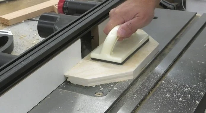 Again, if you don’t have an adjustable roller guide like this one, you can stack two featherboards instead. Ideally, you’d want one of these setups on each side of the bit, providing support as you feed the workpiece in and as it comes out. But since these are short workpieces, I used a paddle to keep pressure on the fence as the workpiece clears the bit.