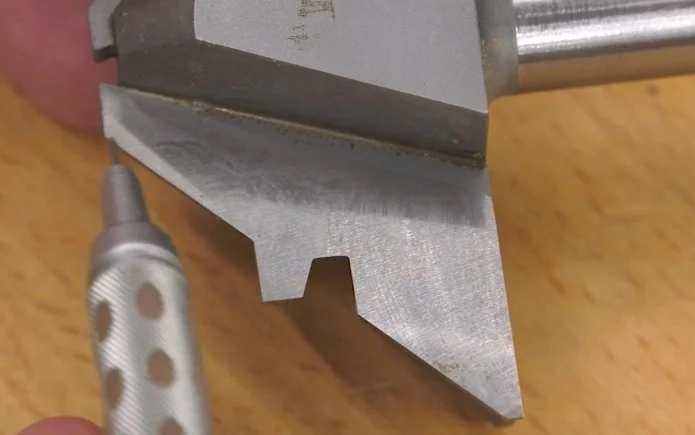First, I measure the full height of the bit’s cutters. Then I measure the thickness of my material. I divide both those numbers in half and add them together. That’s the height that I set my bit above the table.