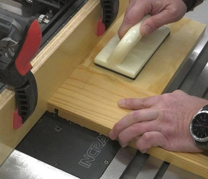 Using a scrap of wood and a push block allows me to keep workpieces perpendicular to the fence