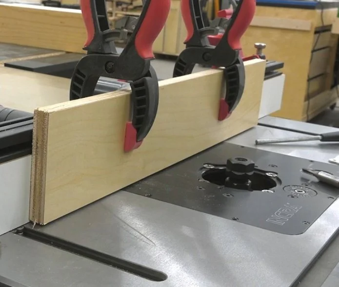 I start by attaching a scrap of wood to my router fence to create an auxiliary face. You’ll see why shortly. Notice I placed it about 1/8" above the top of the table. This just gives the sawdust somewhere to go so it won’t build up.
