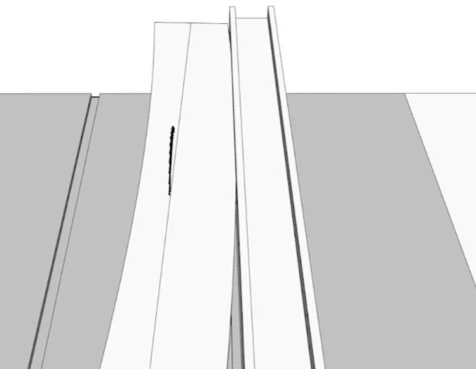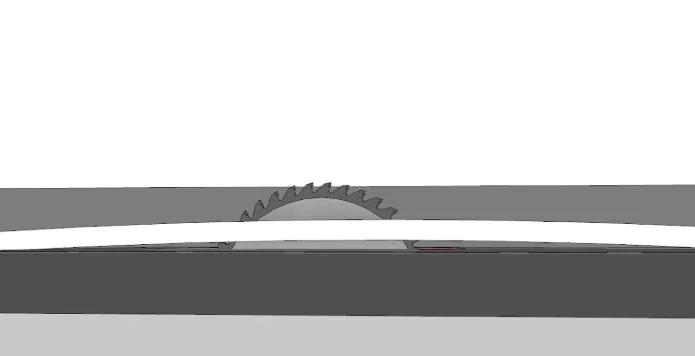 Now, consider a more dangerous scenario. Imagine you’re ripping a board and you twist or rotate it mid-cut. In the below picture, you will see how the cutting path shifts relative to the blade. This puts pressure on the side of the blade, which increases friction and can cause binding—and potentially shoot the board right back at you. If your hand is close to the blade, it may even be pulled in with it.