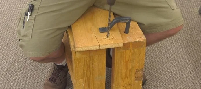 Speaking of working sitting down, the other end of my saw bench doubles as a sit-down work surface, complete with dog holes to secure your workpiece for mortising or other boring tasks. Get it?