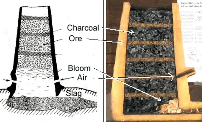 In the early days, iron ore was harvested from the soil and heated in a clay chimney called a bloomery. This process removed the oxides and turned the ore into a usable metal lump known as bloom iron. The bloomery was heated with a charcoal fire, which is pure carbon. The bloom iron produced was so loaded with carbon that it was brittle and unworkable.