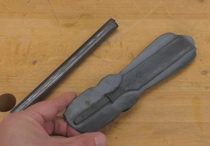Today, steel is cast or extruded and rolled into bars, as shown above. A piece of tool steel like this is heated and forged into shape. Unlike in the past, where tools were shaped by repeated hammer strikes, modern manufacturing uses powerful presses to form the steel.