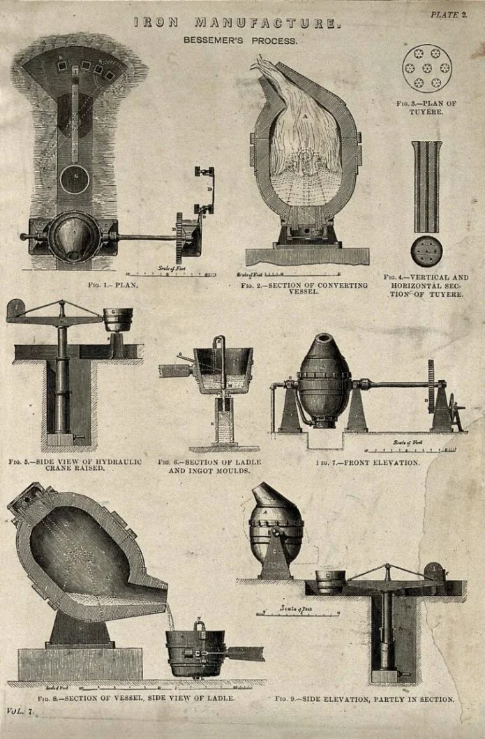 The Bessemer process, developed in the mid-19th century, revolutionized steel production by blasting air into molten metal to remove impurities through oxidation. This allowed for much larger quantities of steel to be produced at a lower cost. However, while the Bessemer process made steel cheaper and more readily available, it was primarily used for industrial purposes like railroad ties, not the high-quality steel needed for tools.