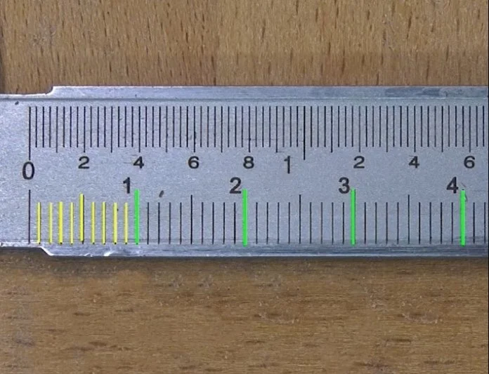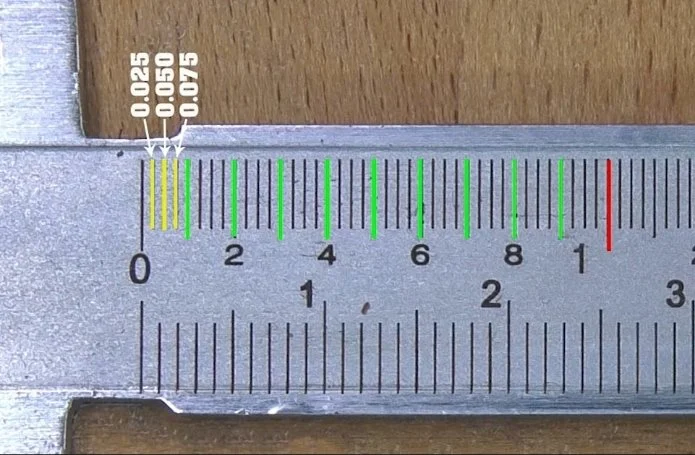So if the large red marks are inches, and the smaller green ones are tenths of an inch, what are those even smaller ones? They represent a quarter of a tenth—or 25 thousandths of an inch (0.025").
