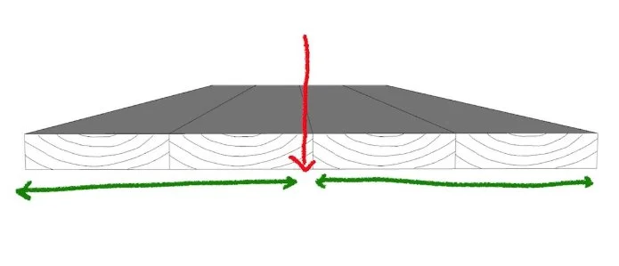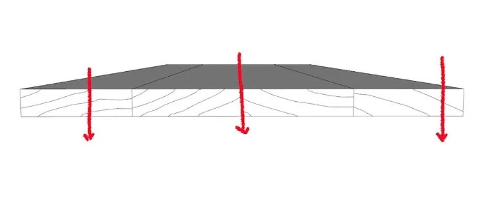 The idea is that, while each of these boards may cup, they’ll do so in alternating directions. Instead of a big potato chip, you might end up with a wavy washboard surface that—while exaggerated here—will be less noticeable overall.