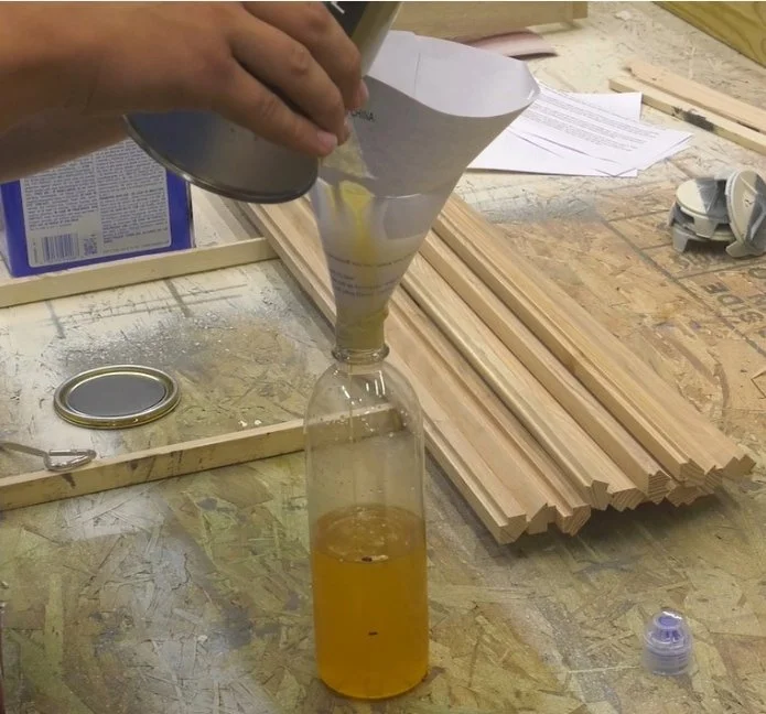 Then immediately pour some into a container and add an equal amount of mineral spirits. It’s that simple. You're looking for about a 50/50 mix. You don’t have to measure it exactly—just eyeball it. The result should be thin enough to wipe on with a cloth or foam brush, but not so thin that it runs easily.