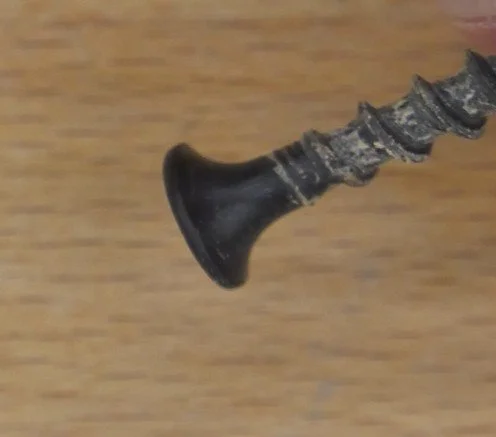 There are also slight ridges around the head of the deck screw to help sever some of the fibers. These differences in head design enabled it to embed below the surface of the white oak without a pre-bored countersink. I drove them as deeply as I could before the threads stripped out the hole, and in one case, a head snapped off.