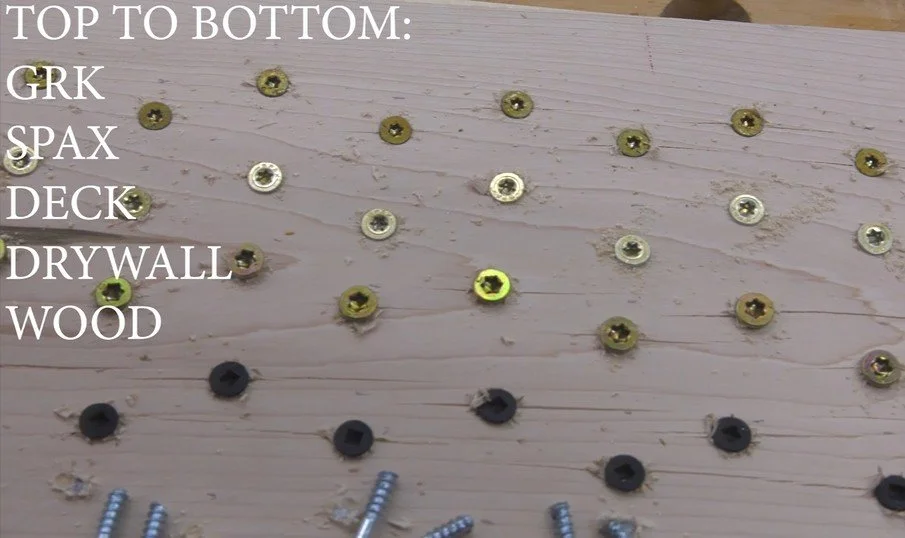 From Left to Right: Regular Wood Screw, Drywall Screw, Deck Screw, Spax Screws, GRK Screws